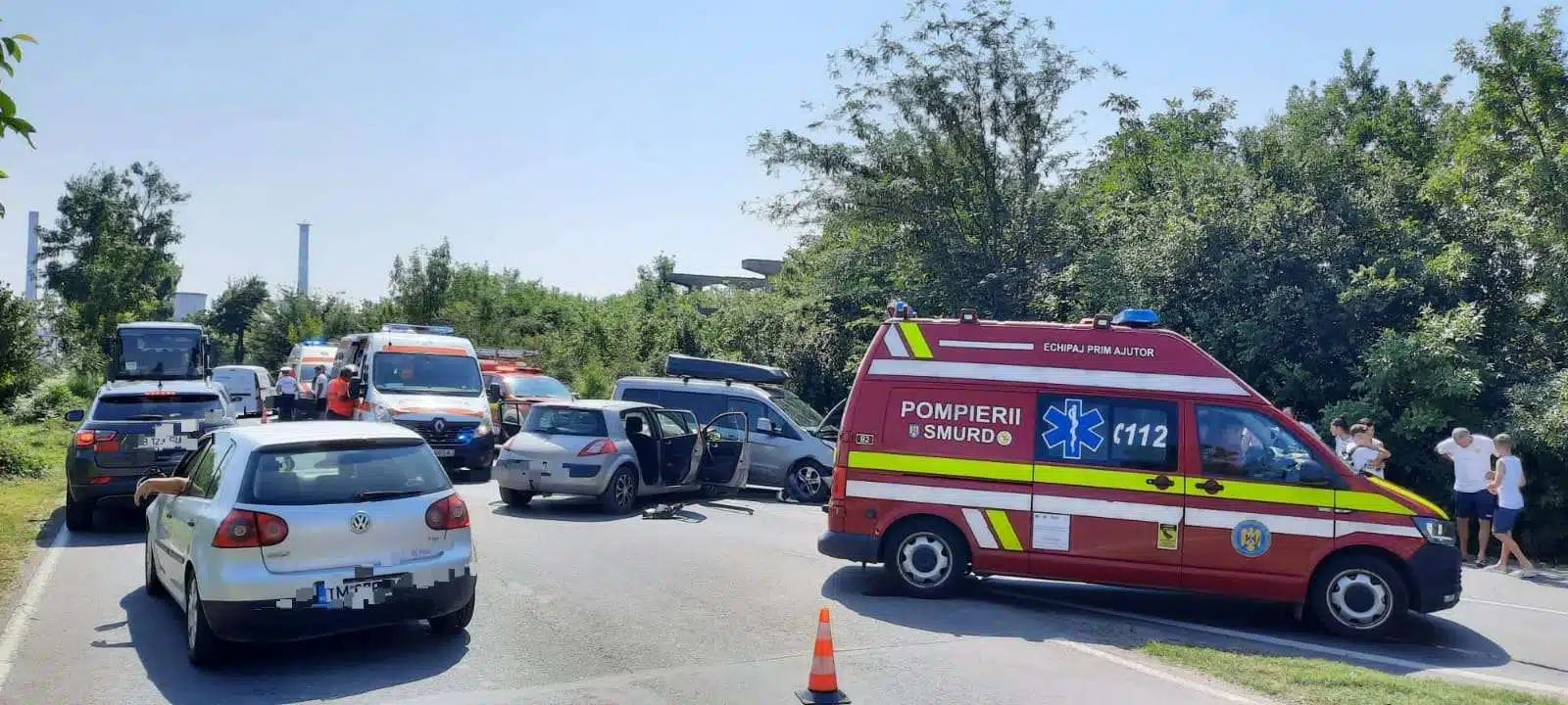 Intervenție de urgență pe strada Ovidiu Cotruș, din Timișoara. Pompierii ISU Timiș au fost solicitați să intervină în urma unui impact devastator intre două autoturisme. 5 persoane au ajuns la spital cu multiple traumatisme.