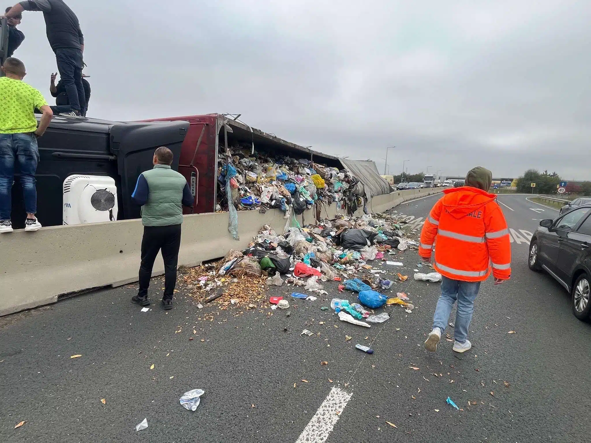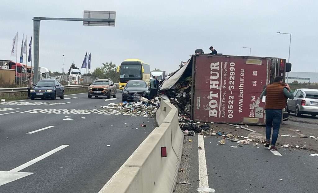 TIMIȘOARA. Trafic blocat pe ambele sensuri după răsturnarea unui camion încărcat cu deșeuri, autoritățile estimează reluarea circulației în jurul orei 17:00