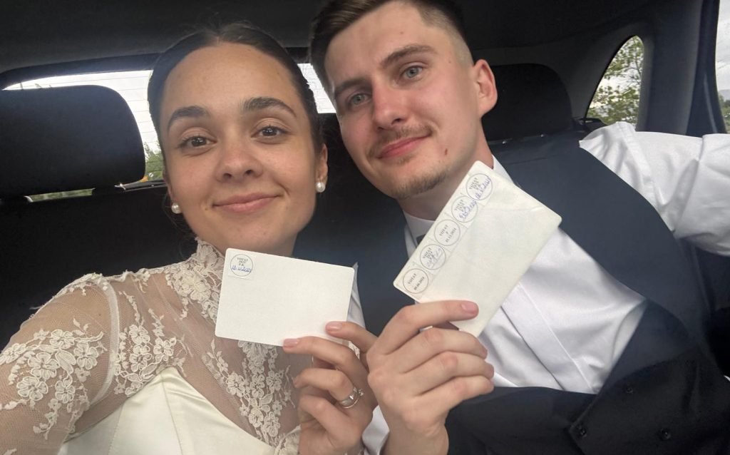 Înainte de a merge la petrecerea de nuntă, cei doi au făcut un popas simbolic și plin de sens. Au intrat în cabina de vot, unde au pus ștampila pe candidatul care, speră ei, le va garanta un viitor mai bun în România.