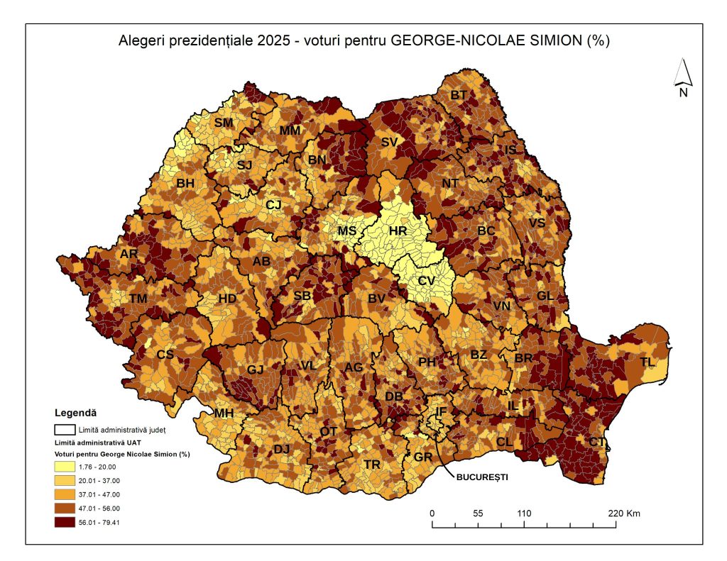 Extinzând analiza la nivel național, datele confirmă o performanță electorală remarcabilă pentru George Simion, cu o hartă electorală dominată de galben în județele țării. Zonele în care Simion a fost depășit vizibil sunt județele Cluj (Nicușor Dan), Harghita, Covasna, Mureș, Bihor, Satu Mare (Crin Antonescu) și câteva centre urbane din țară.