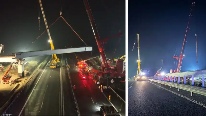 Noaptea trecută au fost instalate trei dintre cele patru grinzi ale viitorului pasaj, fiecare având o lungime impresionantă de 37 de metri. În această noapte, muncitorii vor monta ultima grindă și predalele, esențiale pentru structura de rezistență a pasajului.