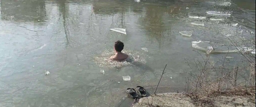 Inca de dimineata cei 20 de temerari, echipați cu răngi si costume de baie si-au croit drum in apa înghețată. Au dat Bucățile uriase de gheata la o parte si s-au încurajat unii pe altii.