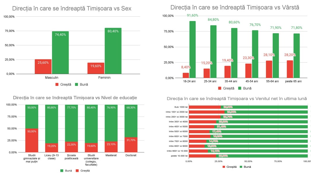 Studiul arată o creștere susținută a satisfacției generale: 86% dintre respondenți se declară mulțumiți de calitatea vieții în Timișoara. Optimiștii sunt mai ales tinerii și femeile, în timp ce în rândul persoanelor vârstnice sau cu venituri reduse se păstrează o atitudine mai rezervată.