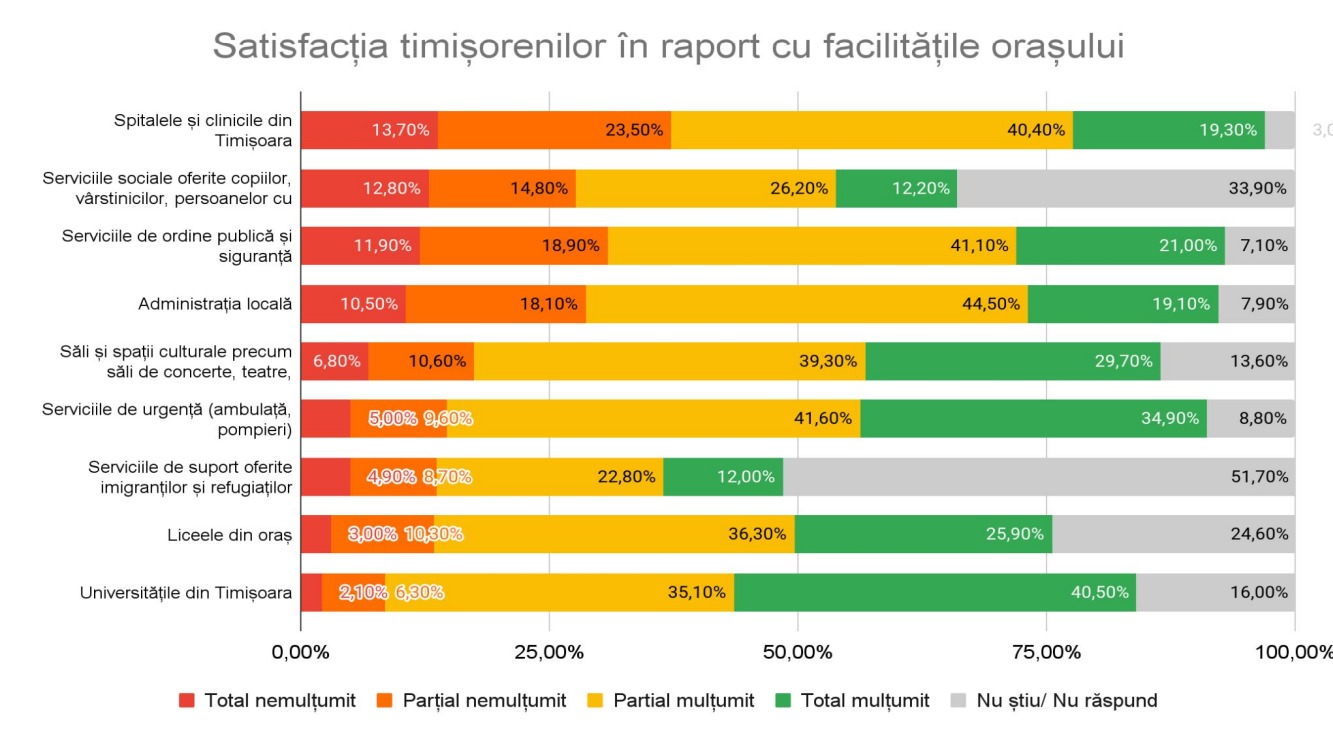 De asemenea, 40% dintre timișoreni nu sunt mulțumiți de curățenia orașului. Problema locurilor de parcare persistă în cartiere, deși gradul de satisfacție a crescut ușor (de la 38% la 41%) după desființarea garajelor și amenajarea de parcări noi.