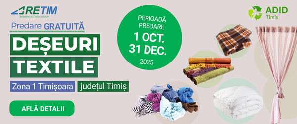 RETIM Ecologic Service S.A. și Asociația de Dezvoltare Intercomunitară Deșeuri Timiș (ADID Timiș) anunță o nouă campanie trimestrială de colectare gratuită a deșeurilor textile, desfășurată în perioada 1 octombrie – 31 decembrie 2025.