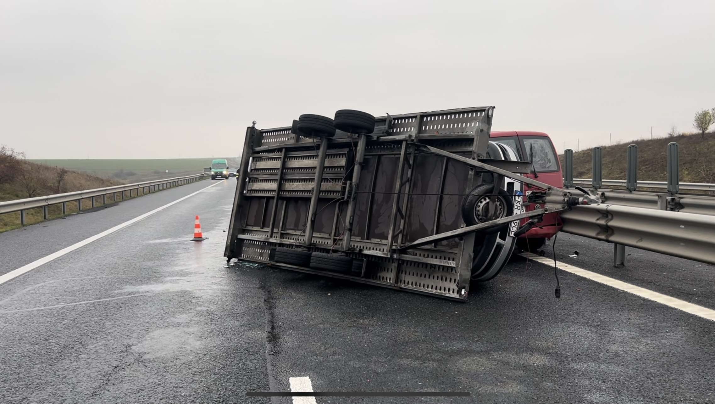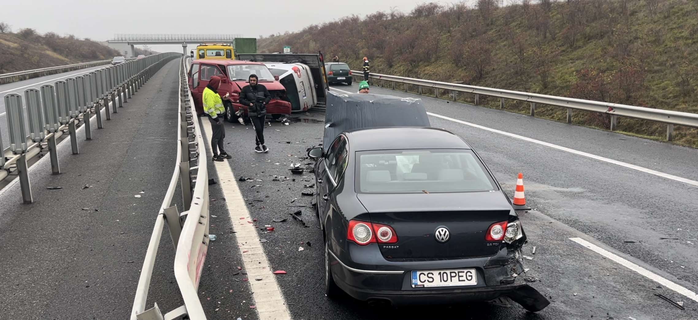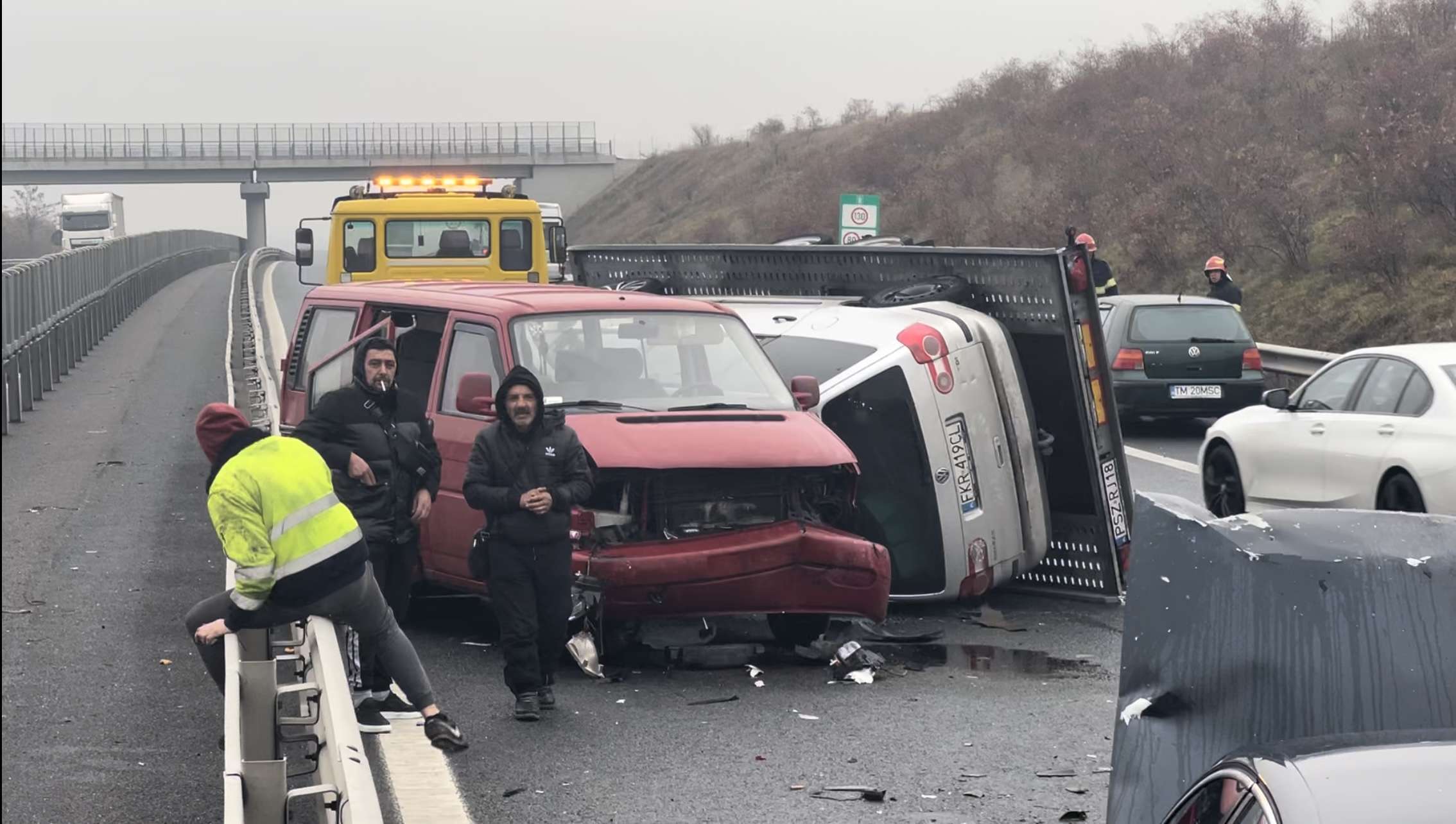 Soferul microbuzului înmatriculat in Polonia, a pierdut controlul volanului si a intrat in balans. Acesta a fost momentul in care masina aflata pe platforma s-a rasturnat pe carosabil. Doua autoturisme care circulau regulamentar nu au putut evita microbuzul. In urma impactului, soferul ultimei masini a ajuns la spital. Ceilalti 8 pasageri din masinile implicate in accident nu au avut nevoie de ingrijiri medicale. Circulația in zona a fost îngreunată. Oamenii legii estimează ca in jurul orei 16:00 circulația va fi redeschisă complet.