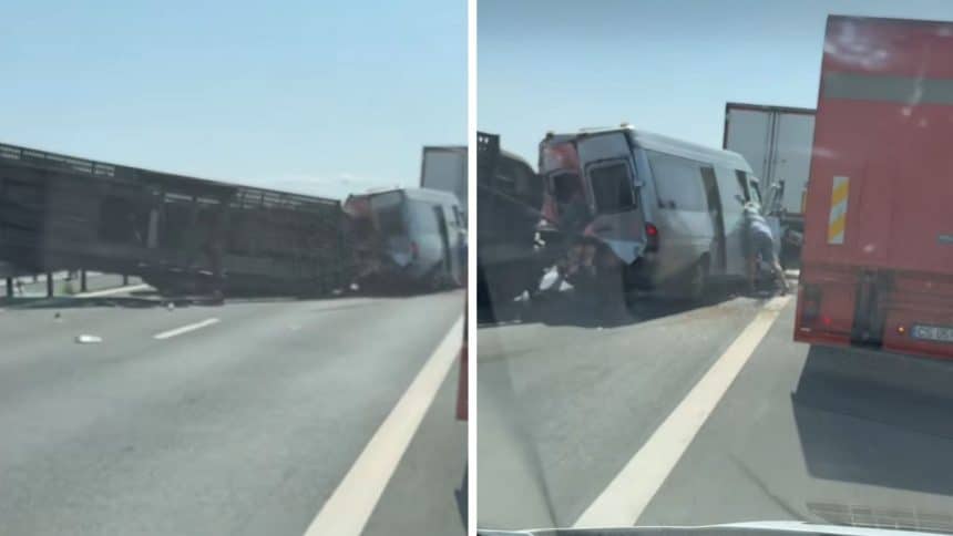 Un accident grav a avut loc pe autostrada A1, la Km 469 înspre localitatea Traian Vuia. În impact au fost implicate un microbuz care tracta două autoturisme pe platformă, un autoturism și o dubiță