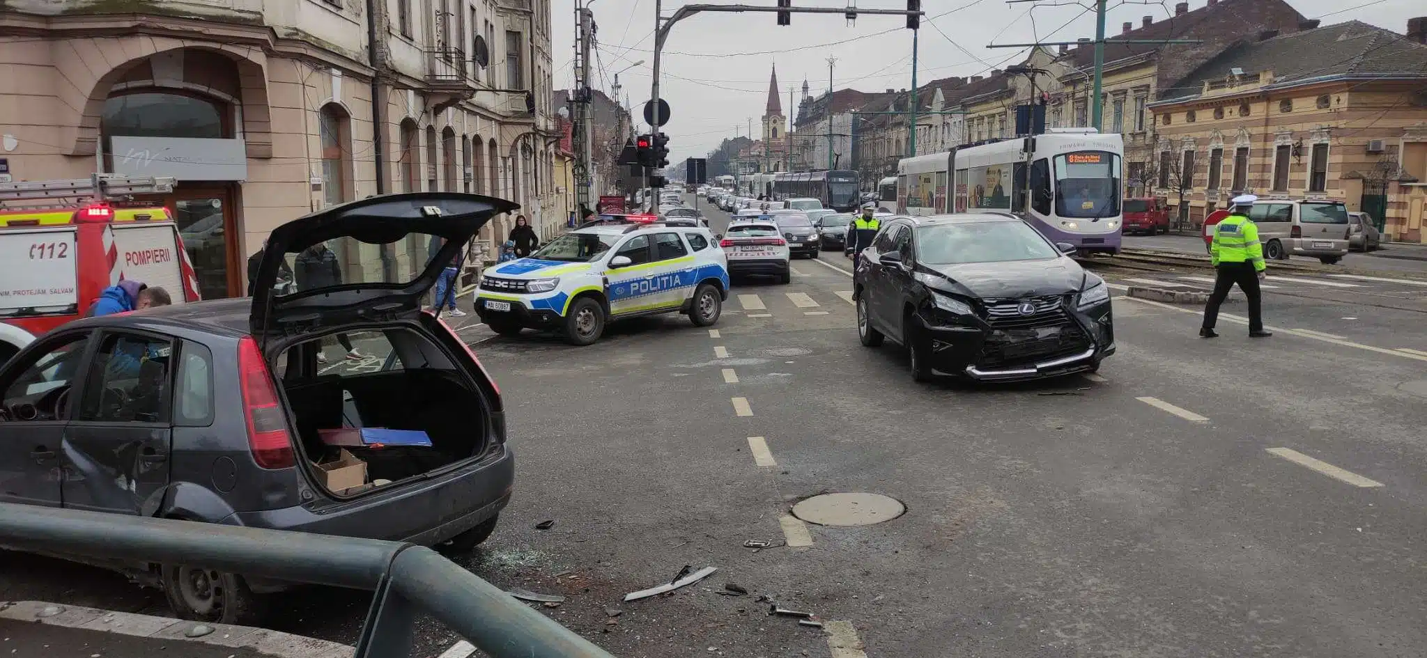 O femeie, în vârstă de 66 ani, a condus un autoturism pe bulevardul General Ion Dragalina dinspre bulevardul Republicii înspre bulevardul 16 Decembrie, iar la intersecția cu Spaliul Tudor Vladimirescu în urma efectuării virajului la stânga a intrat în coliziune cu un autoturism, condus de către un bărbat, în vârstă de 67 de ani, care circula pe sensul opus de mers.