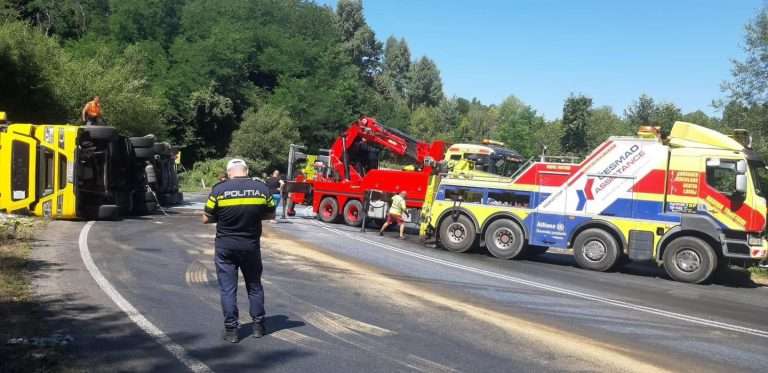 Accident rutier pe DN 6 în zona Domașnea. O cisternă s-a răsturnat, circulația desfășurându-se în prezent pe o singură bandă.