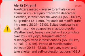 Inspectoratul General pentru Situații de Urgență a transmis la rândul său o alertă de tip extrem, recomandând populației să evite deplasările și să ia măsuri de autoprotecție. Condițiile meteo pot pune în pericol siguranța persoanelor și pot genera pagube materiale.