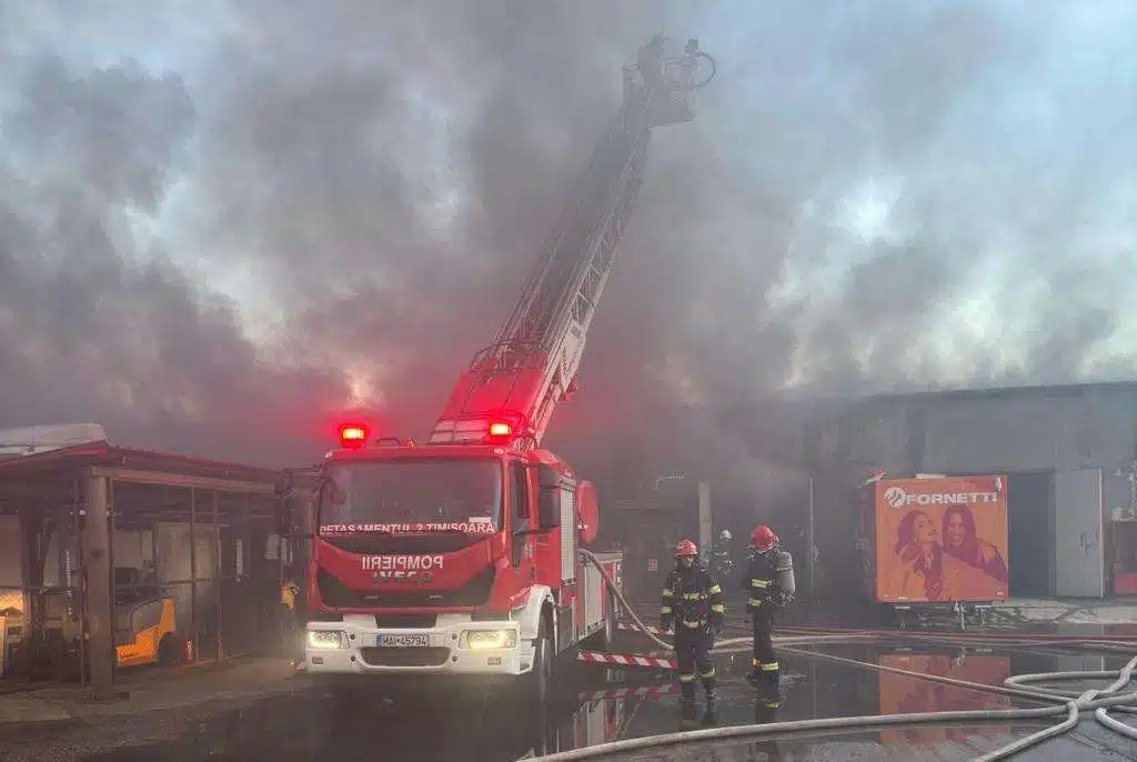 Din primele informații, incendiul se manifestă la interiorul unei hale și la acoperiș, pe o suprafață de aproximativ 2000 mp” transmit reprezentanții ISU Timiș.