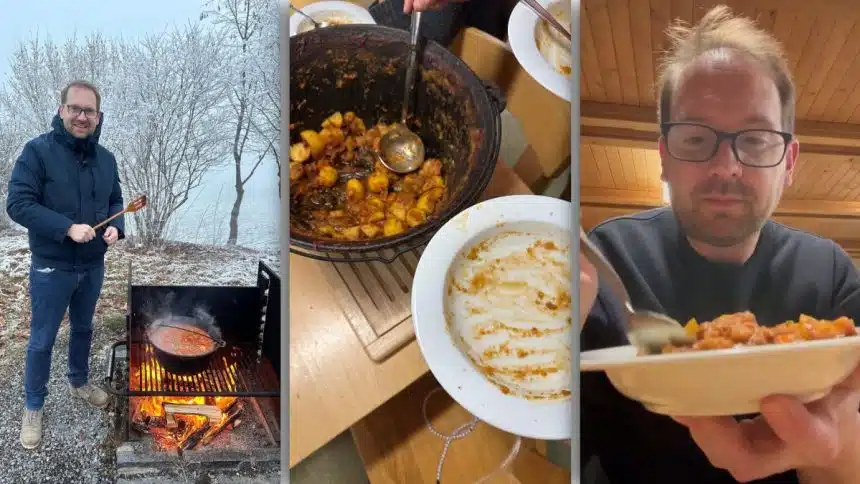 În mijlocul iernii, la o temperatură de -5 grade Celsius, Dominic Fritz a gătit primul său ceaun din viață, un gulaș bănățean preparat în aer liber. Experiența culinară a fost împărtășită pas cu pas, de la alegerea ingredientelor până la provocările întâmpinate în procesul de gătire, carnea fiind lăsată la foc timp de aproape patru ore, pe măsură ce ziua s-a transformat în seară.