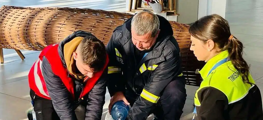 „La fața locului a sosit imediat echipa de prim ajutor integrat care a constatat imedicat că este vorba despre un stop cardio-respirator. S-au început manevrele de resuscitare urmate de protocolul primului ajutor avansat: montarea pipei Guedel, oxigen cu balon de ventilatie și medicație. Pentru că în incinta Aeroportului Internațional Timișoara “Traian Vuia” există două defibrilatoare automate externe (AED), unul dintre ele a fost folosit în acest stop cardio-respirator. Manevrele de prim ajutor au durat 15 minute, până când victima a prezenta tsemne că își revine și a fost preluată de echipajul de prim ajutor de pe ambulanță ” Aeroportul International Traian Vuia