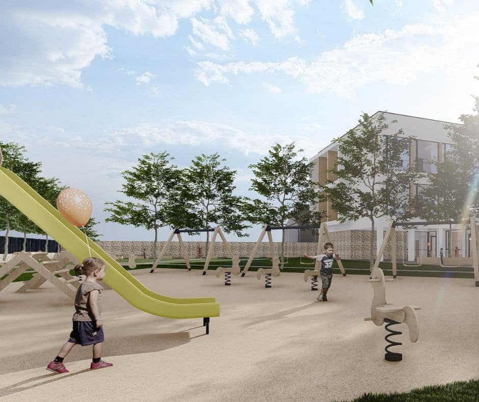 În exterior, proiectul include amenajarea unor locuri de joacă moderne, cu o suprafață de aproape 250 de metri pătrați, precum și zone verzi generoase, menite să ofere un cadru prietenos și sigur pentru activitățile în aer liber ale celor mici.