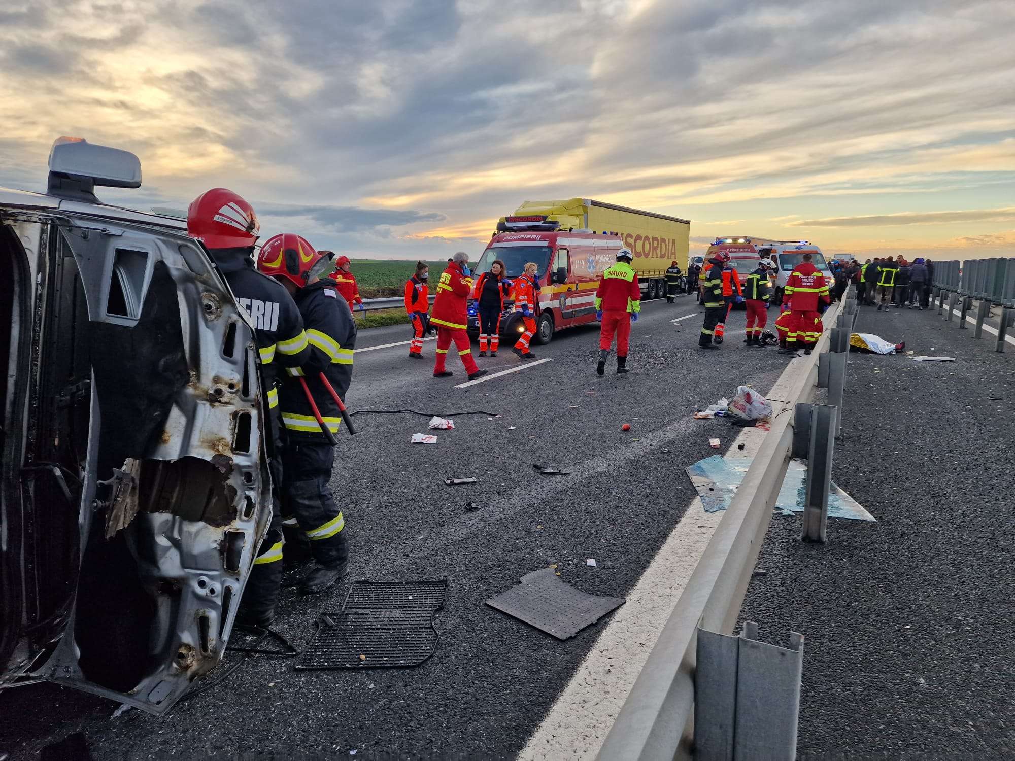 8 ambulante si un elicopter au ajuns cu greu la fata locului. Accidentul s-a petrecut pe A1 la km 570-571 Nadlac -Pecica. Un barbat care se afla in microbuz si-a pierdut viata. Din primele cercetări se pare că una din roțile microbuzului a explodat şi astfel s-a produs acest accident. În microbuzul înmatriculat în Bulgaria se aflau pasageri din Republica Moldova. În acest moment se fac cercetări la faţa locului. După prima evaluare medicală, o persoana a suferit rani grave si a fost transportată de urgenta la spitalul din Arad.