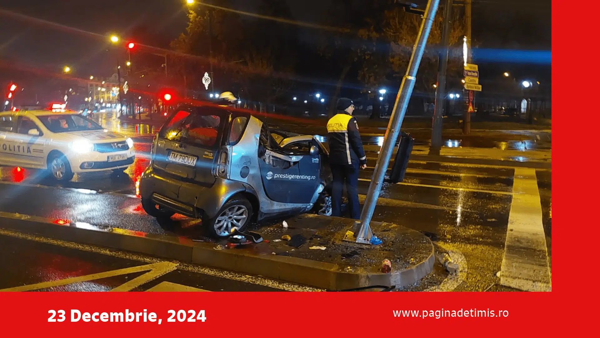 „Un tânăr în vârstă de 22 de ani a condus un autoturism pe strada Michelangelo și, la intersecția cu strada Mihai Eminescu, a pierdut controlul asupra direcției de deplasare și a intrat în coliziune cu stâlpul de susținere al semaforului electric. În urma evenimentului rutier a rezultat rănirea conducătorului auto, acesta fiind transportat la spital pentru îngrijiri medicale. Tânărul a fost testat cu aparatul alcooltest, rezultatul fiind negativ”, a transmis IPJ Timiș.