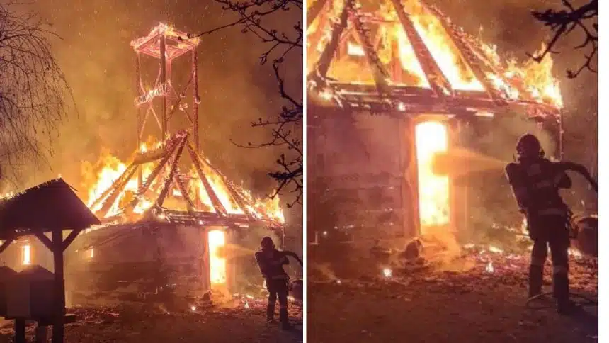 Incendiul violent a distrus lăcașul de cult în totalitate. Pompierii au luptat pentru a salva clădirile din apropiere.