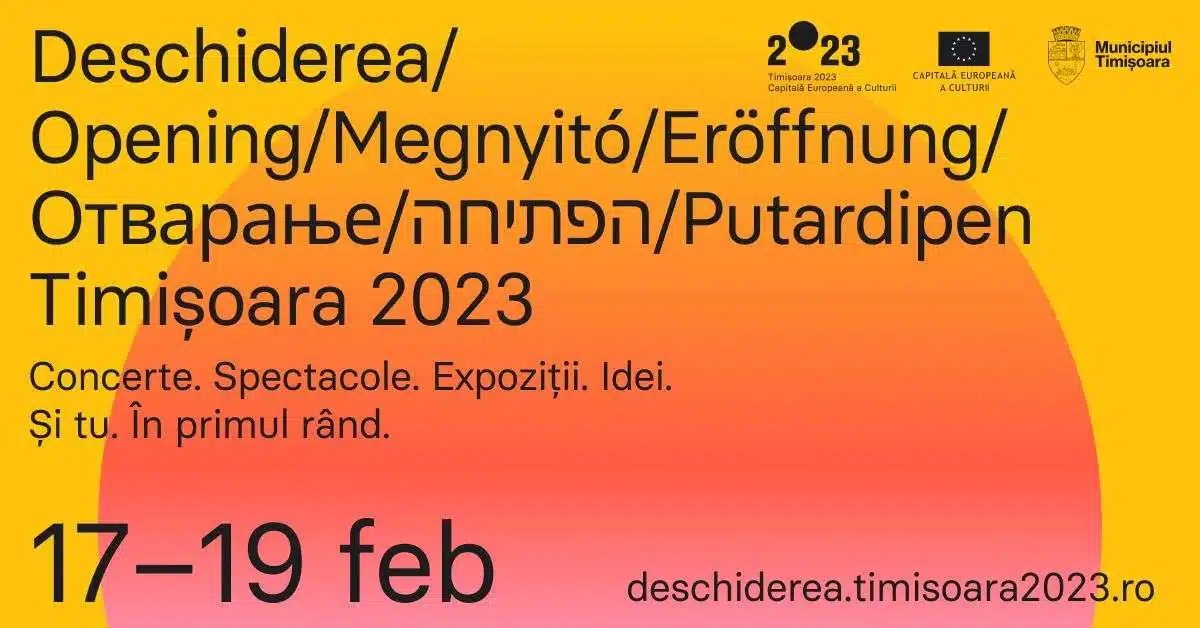 ,Deschidem un an irepetabil, mult-așteptat, cel în care Timișoara este Capitală Europeană a Culturii. Deschiderea Timișoara 2023 înseamnă spectacole memorabile, artă curajoasă, idei care deschid lumea, vizitatori din Europa întreagă și comunități deschise.Timișorenii și oaspeții din întreaga lume vor participa vineri, 17 februarie, la evenimentul festiv Sărbătorim Deschiderea! din Piața Unirii, sărbătorind diversitatea culturală care caracterizează Programul Cultural național „Timișoara – Capitală Europeană a Culturii în anul 2023”.