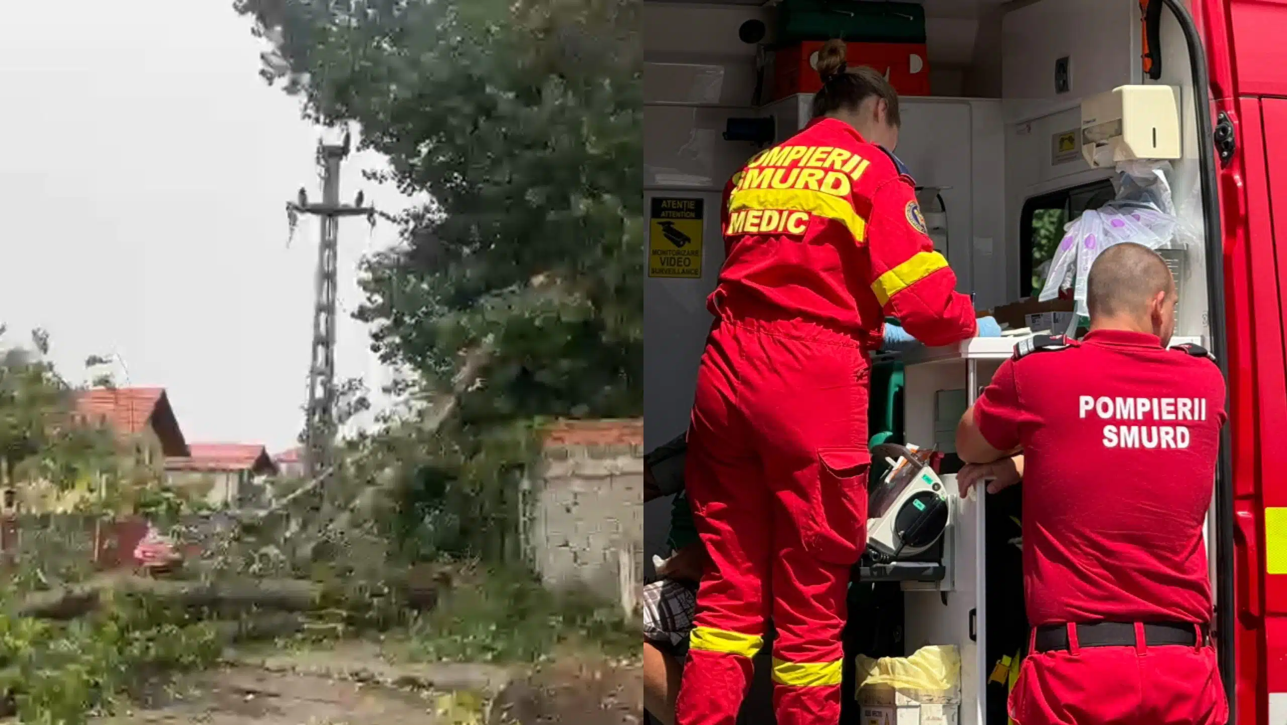 Femeia, lovită la cap, a fost transportată de urgență la spital, dar se află în afara pericolului. Pompierii au intervenit rapid pentru a îndepărta copacul rupt de vijelie