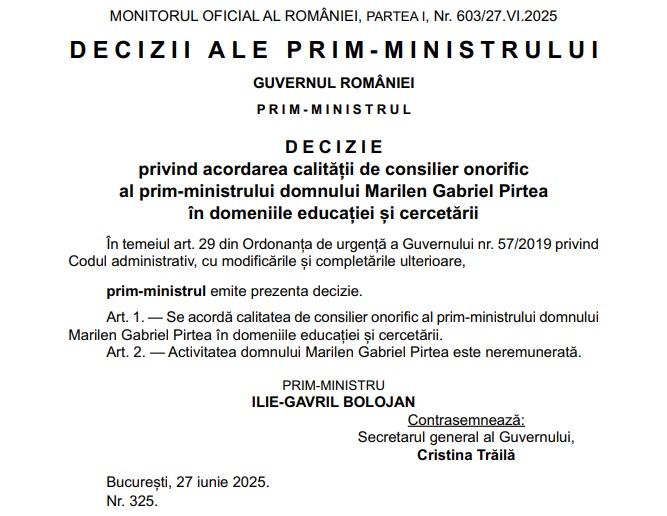 Potrivit deciziei primului ministru publicată în Monitorul Oficial, Marilen Pirtea va activa în această calitate fără remunerație