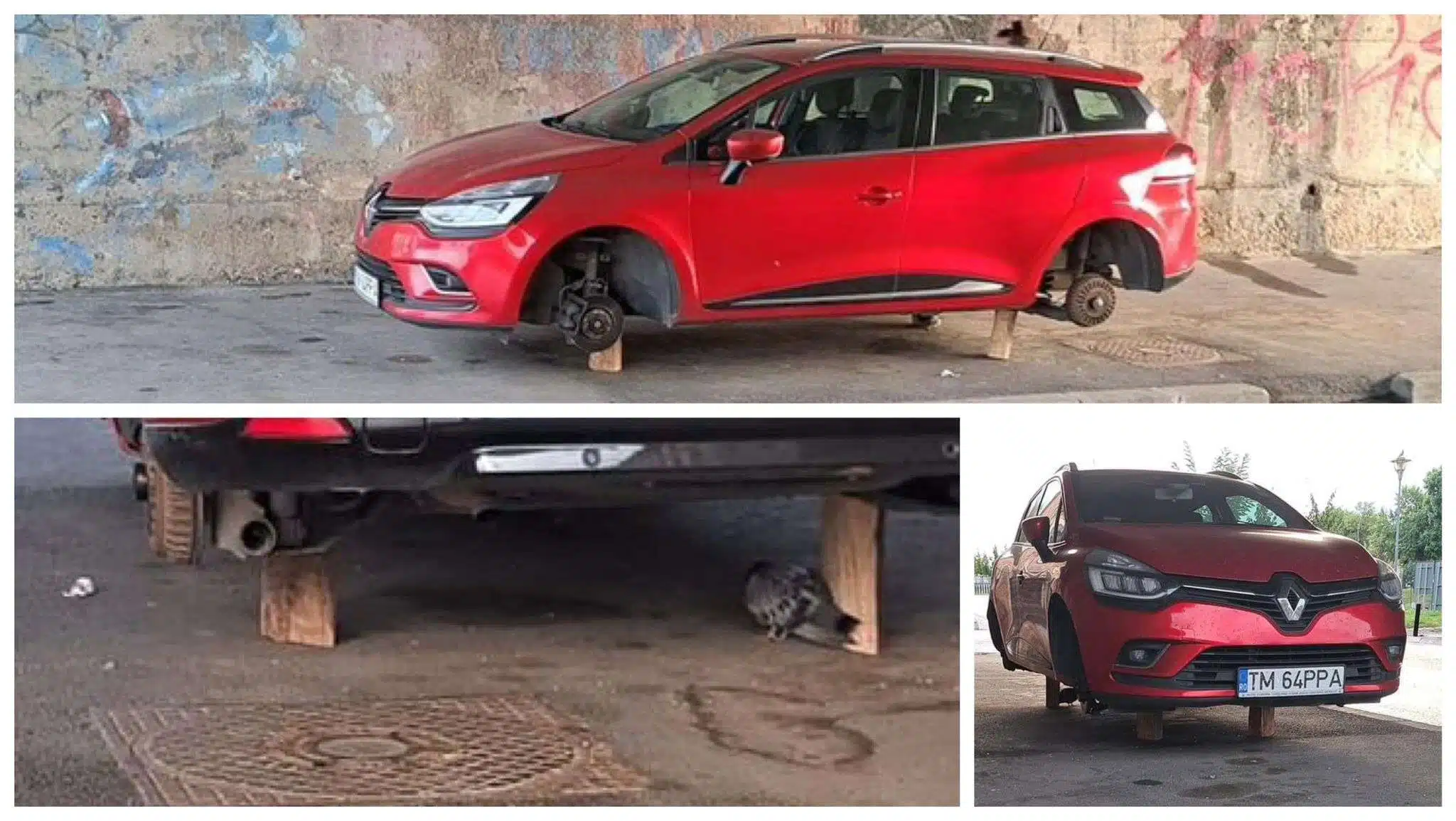 Descoperirea a fost făcută luni dimineața pe Splaiul Nicolae Titulescu din Timișoara. Proprietarul mașinii povestește că în momentul în care a mers la autoturismul care era parcat sub podul Iuliu Maniu, a găsit-o fără roți. Mai mult decât atât, era abandonată pe butuci.