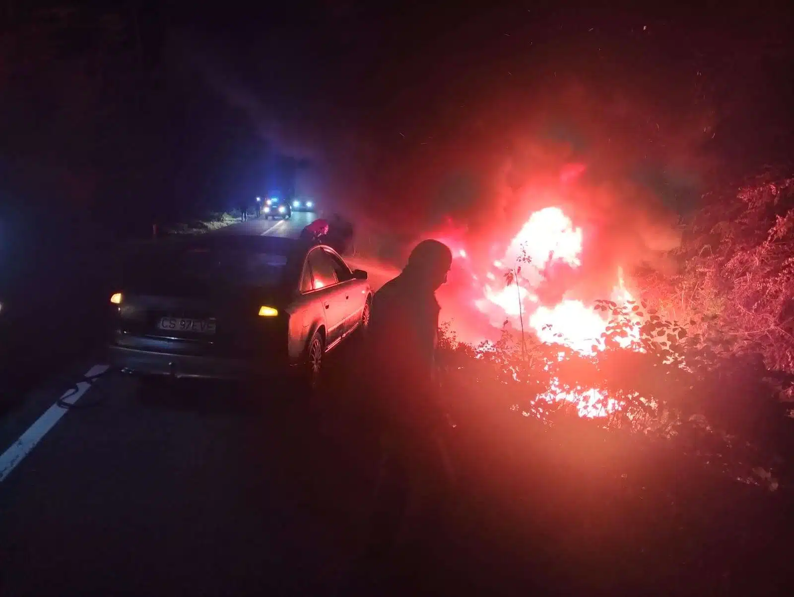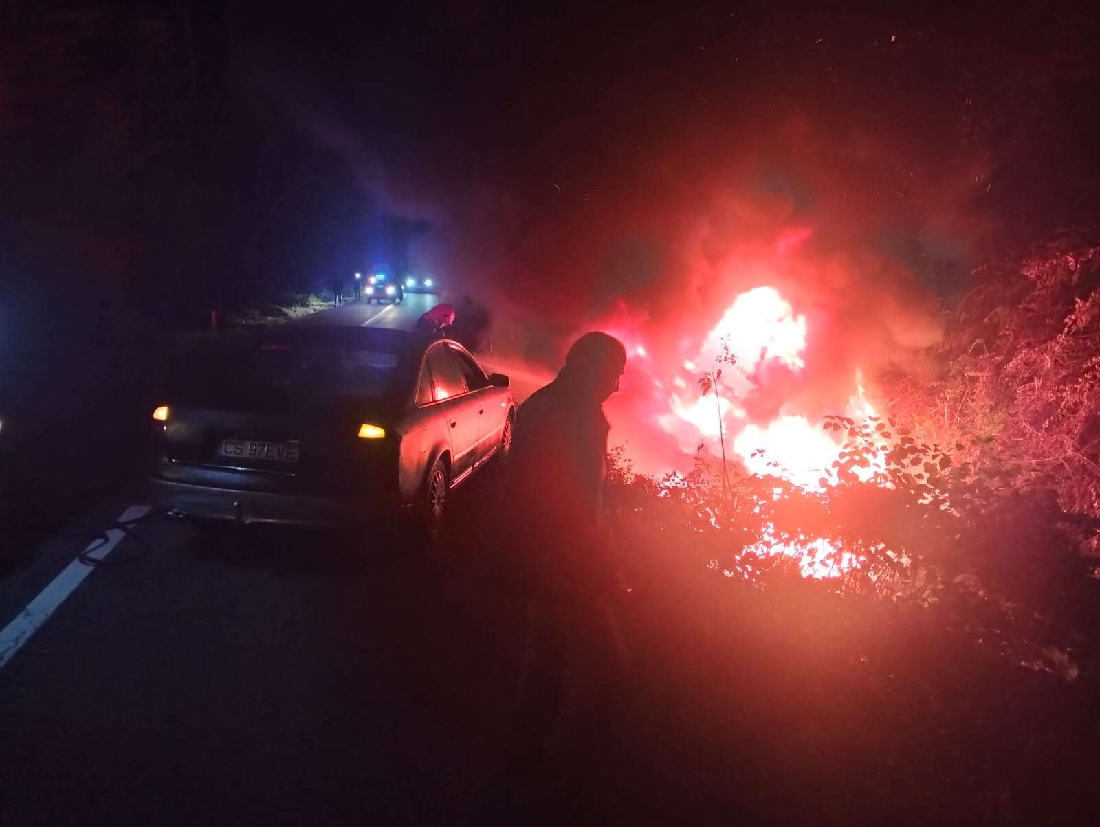 Mașină în flăcări și accident violent lângă Reșița. Autoturism răsturnat și incendiat, dar fără victime