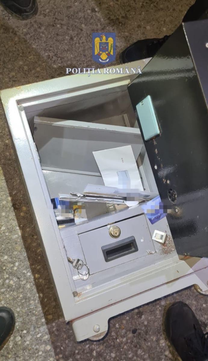 ”În timp ce aceștia se deplasau către un loc sigur pentru forțarea seifului, respectiv în apropierea localității Poiana lui Stânga, aceștia au fost imobilizați de polițiștii Direcției Operațiuni Speciale și predați polițiștilor de investigații criminale din Timiș, care i-au condus la audieri. S-a constat că, în interiorul mașinii, se aflau mai multe dispozitive folosite la comiterea faptei, printre care și un aparat de bruiaj unde GSM și radio, seiful sustras și două recipiente de motorină”, potrivit IPJ Timiș.