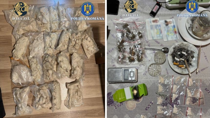 Percheziția domiciliară efectuată în 28 noiembrie a scos la iveală o cantitate impresionantă de droguri: 23 de pungi cu 11,5 kilograme de 4-CMC, alături de 29 de plicuri cu substanțe cristaline și vegetale, obiecte cu urme de drog și alte mijloace de probă relevante pentru anchetă.