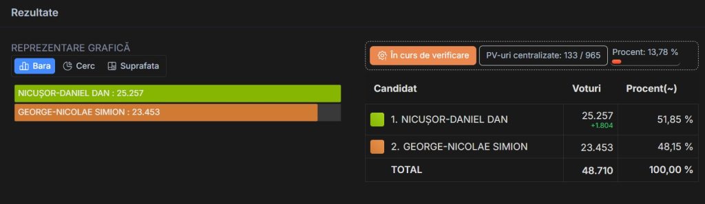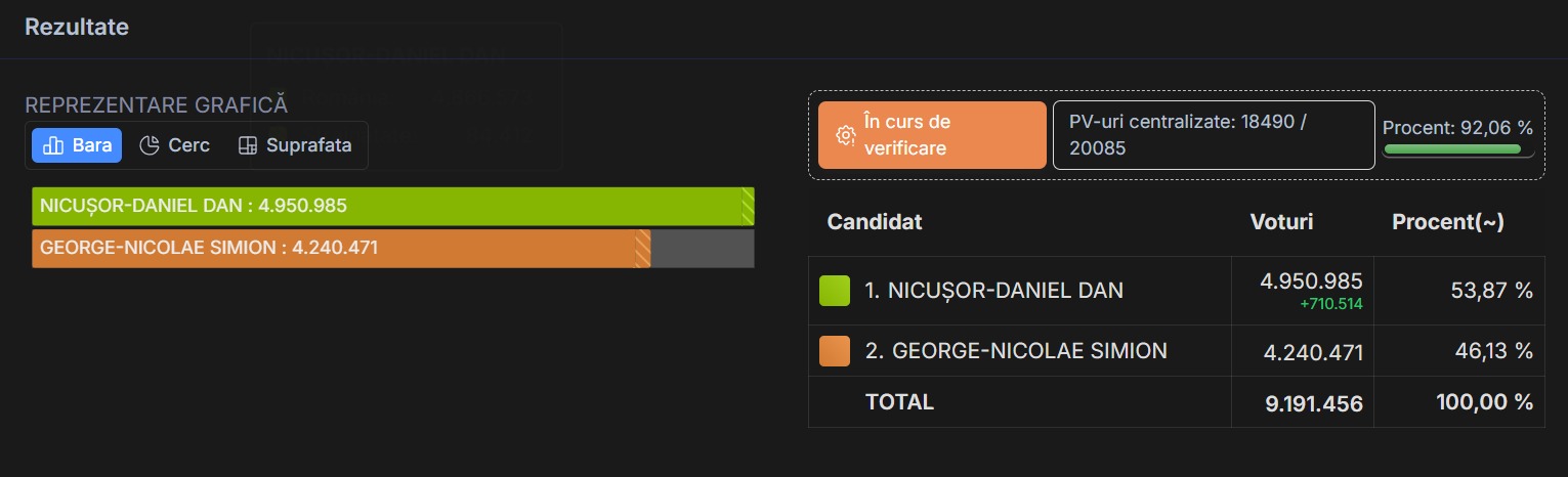 Curs: Nicușor Dan – 54,1%. George Simion – 45,9%