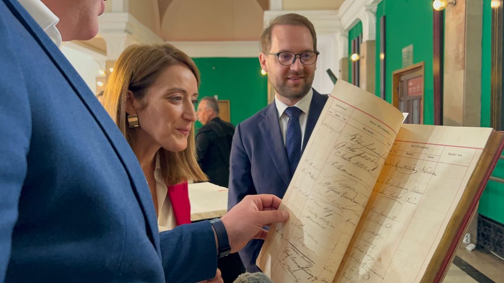 Vizita s-a încheiat cu semnarea în cartea de onoare a Filarmonicii Banatul, pentru ca mai apoi, Metsola să viziteze Primăria Timișoarei.