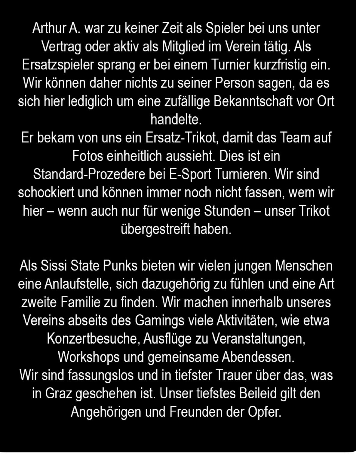 Arthur A. nu a fost niciodată jucător la noi sub contract sau membru activ al clubului. În calitate de jucător de rezervă, a intervenit pe neașteptate la un turneu. Prin urmare, nu putem spune nimic despre persoana sa, deoarece a fost doar o cunoștință întâmplătoare de la fața locului. A primit de la noi un tricou de rezervă, pentru ca echipa să arate uniform în poze. Acesta este un procedeu standard la turneele de E-Sport. Suntem șocați și încă nu ne putem imagina cui i-am dat – chiar și pentru doar câteva ore – tricoul nostru. Ca Sissi State Punks, oferim multor tineri un loc unde să se simtă acceptați și să găsească un fel de a doua familie. În cadrul clubului nostru, pe lângă gaming, organizăm multe activități precum vizite la concerte, excursii la evenimente, ateliere și cine comune. Suntem consternați și în doliu profund pentru ceea ce s-a întâmplat la Graz. Cele mai sincere condoleanțe ale noastre merg către rudele și prietenii victimelor” se arată într-o postare pe platforma ,,X”.