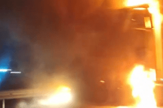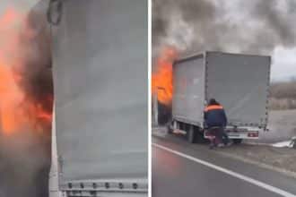 VIDEO. Pericol de explozie, pe A1. Un tir a fost mistuit de flăcări