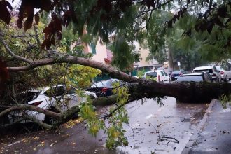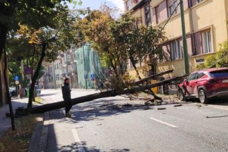 VIDEO | Copac prăbușit pe o stradă din Timișoara. Mașină avariată și cabluri STPT afectate
