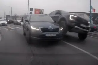 Scene șocante la Timișoara. Șoferul unui bolid a urcat cu mașina pe un alt vehicul în sensul giratoriu de lângă Iulius Mall. VIDEO