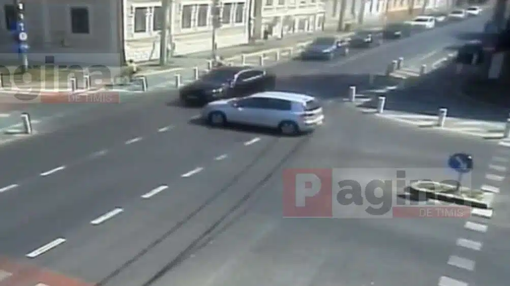 În tot acest timp, semaforul s-a schimbat în roșu, iar din sensul opus un autoturism intră în intersecție. Impactul cu bolidul a fost iminent.