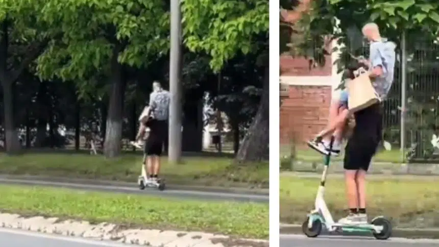Unul dintre tineri stătea cocoțat pe umerii celuilalt, în timp ce acesta conducea trotineta în viteză. Mai grav este că tânărul aflat pe umeri era concentrat asupra telefonului mobil, complet indiferent la pericolul în care se afla.