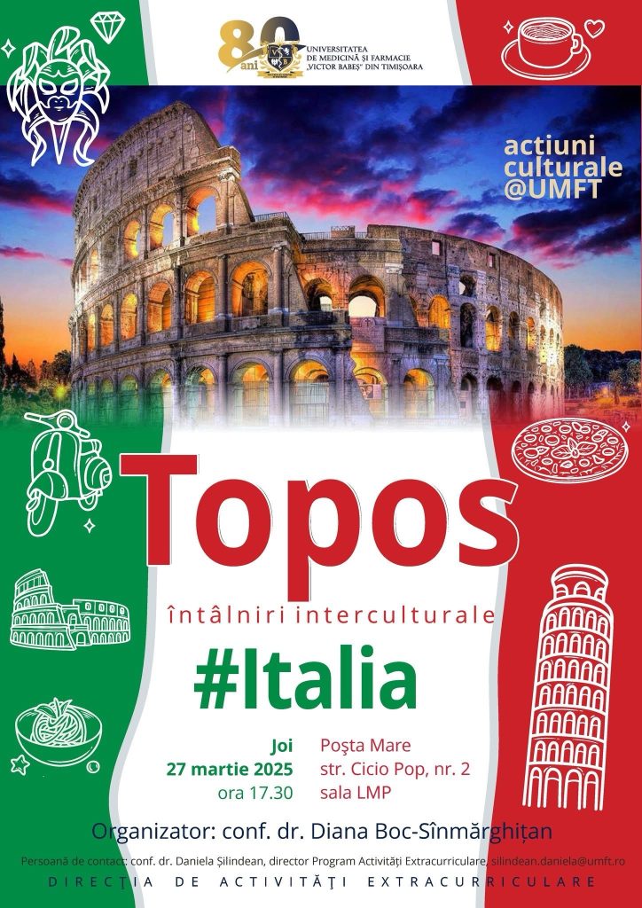 Universitatea de Medicină și Farmacie „Victor Babeș” din Timișoara aduce Italia mai aproape de sufletul Banatului, în cadrul celui de-al doilea eveniment Topos – Întâlniri interculturale. Joi, 27 martie, de la ora 17.30, în sala LMP din clădirea Poșta Mare (strada Cicio Pop nr. 2), participanții vor păși într-o călătorie culturală vibrantă, ghidați de studenți italieni ai universității.