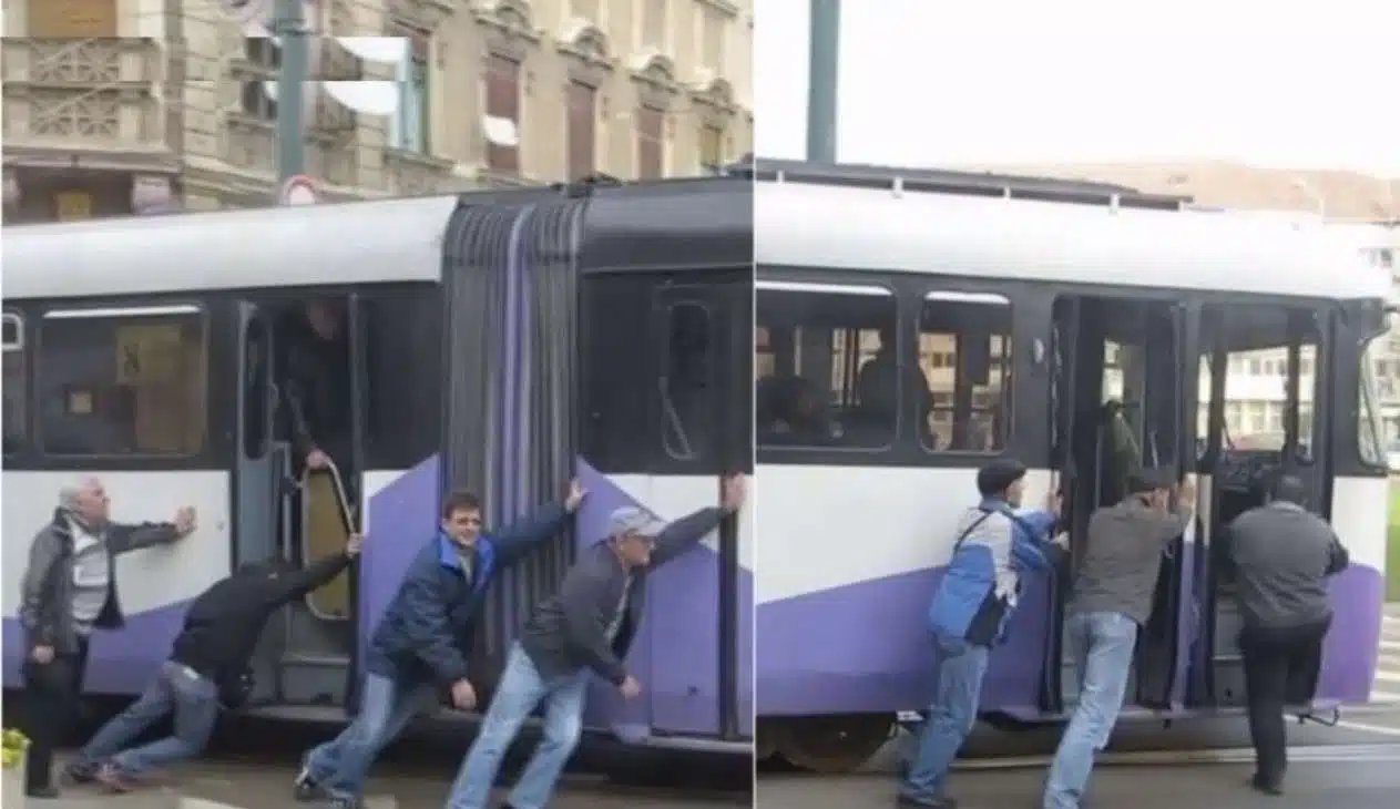 Din cauza acestei manevre, garnitura rămas fără curent şi s-a blocat. Pentru a debloca drumul și pentru a-și continua călătoria, mai mulți pasageri din tramvai s-au dat jos și au început să împingă tramvaiul.