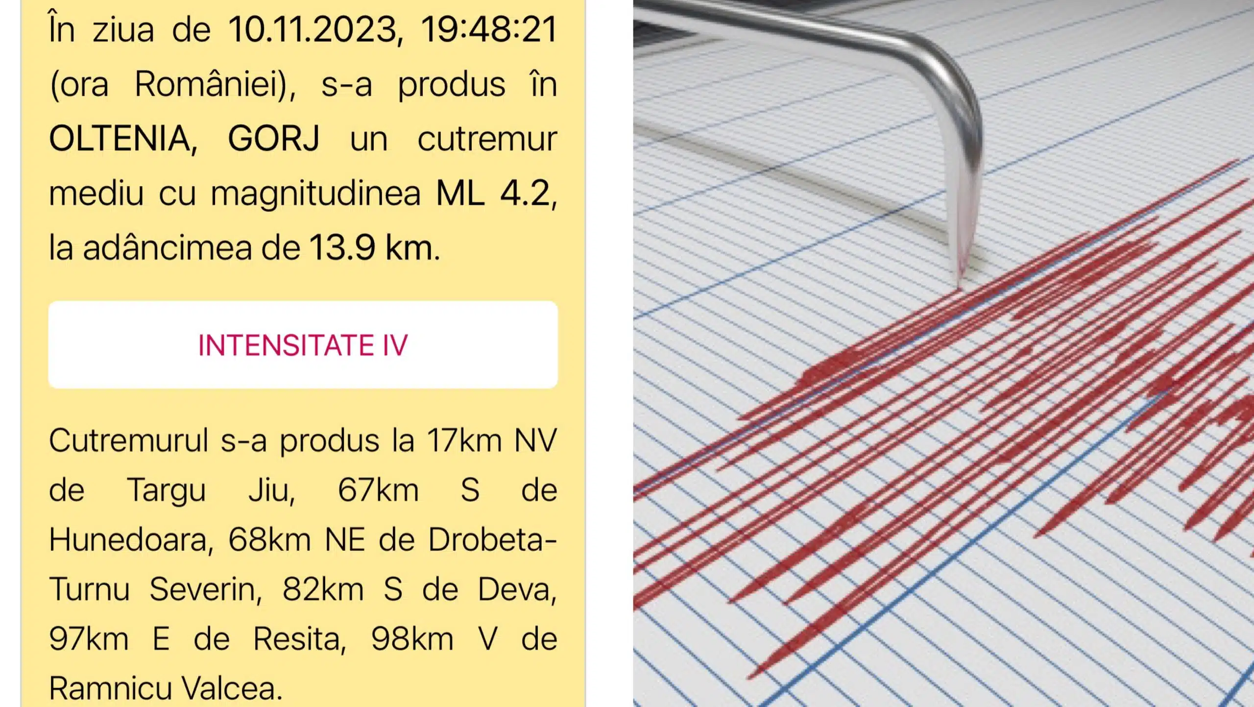 Un cutremur mediu cu magnitudinea 4,2 s-a produs vineri seara la ora 19:48 în judeţul Gorj, potrivit datelor afişate de Institutul Naţional de Cercetare-Dezvoltare pentru Fizica Pământului