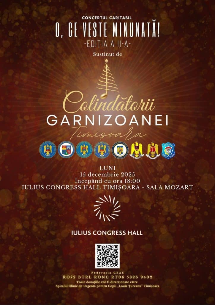 Timișoara găzduiește luni, 15 decembrie, cea de-a II-a ediție a Concertului Caritabil „Colindătorii Garnizoanei Timișoara”, un eveniment devenit tradiție în perioada sărbătorilor de iarnă. Peste 100 de militari și funcționari publici cu statut special vor urca pe scenă pentru a aduce bucurie micilor pacienți ai Spitalului Clinic de Urgență pentru Copii „Louis Țurcanu” și pentru a strânge fonduri destinate dotării cu mobilier nemedical a noului corp de clădire al spitalului.
