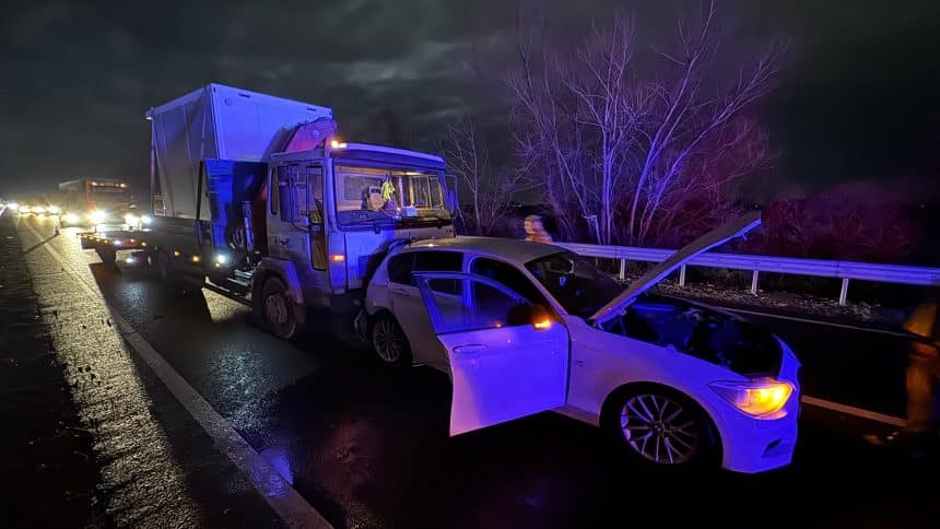 Pompierii din cadrul Detașamentului 1 Timișoara intervin pentru asigurarea măsurilor PSI în urma unei tamponări între trei autovehicule produse pe Centura Timișoarei, dinspre DN6 spre DN59, spre Giroc.