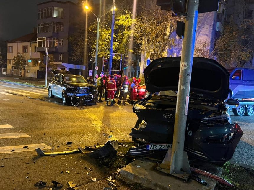 Un accident rutier în lanț a avut loc duminică seara în apropierea Inspectoratului Județean de Poliție din Timiș, în intersecția de la Punctele Cardinale. Trei autoturisme s-au ciocnit violent după ce, potrivit primelor indicii, unul dintre șoferi nu ar fi respectat culoarea roșie a semaforului.