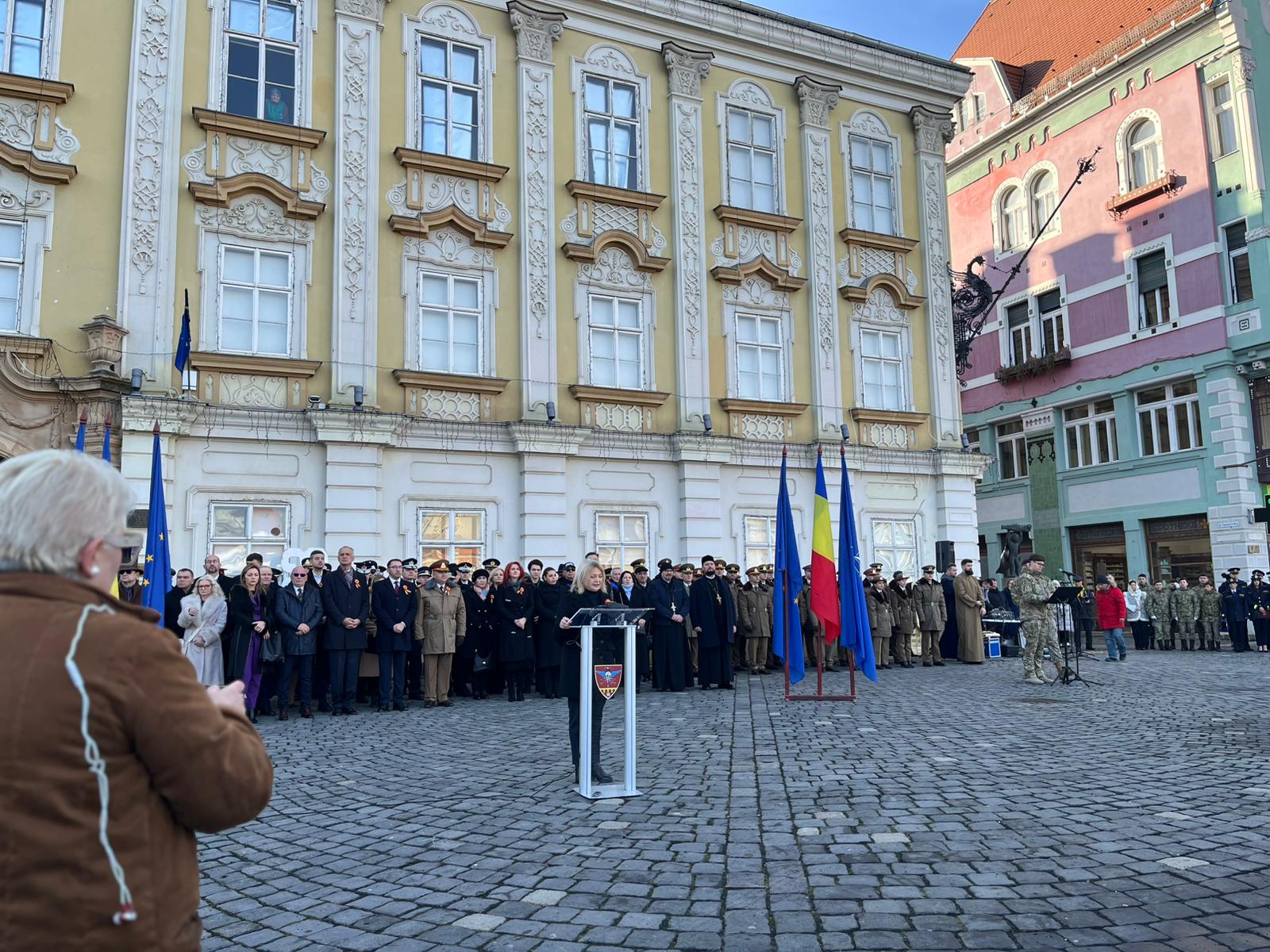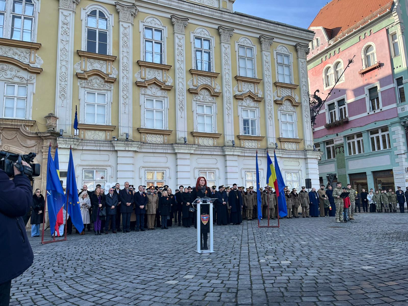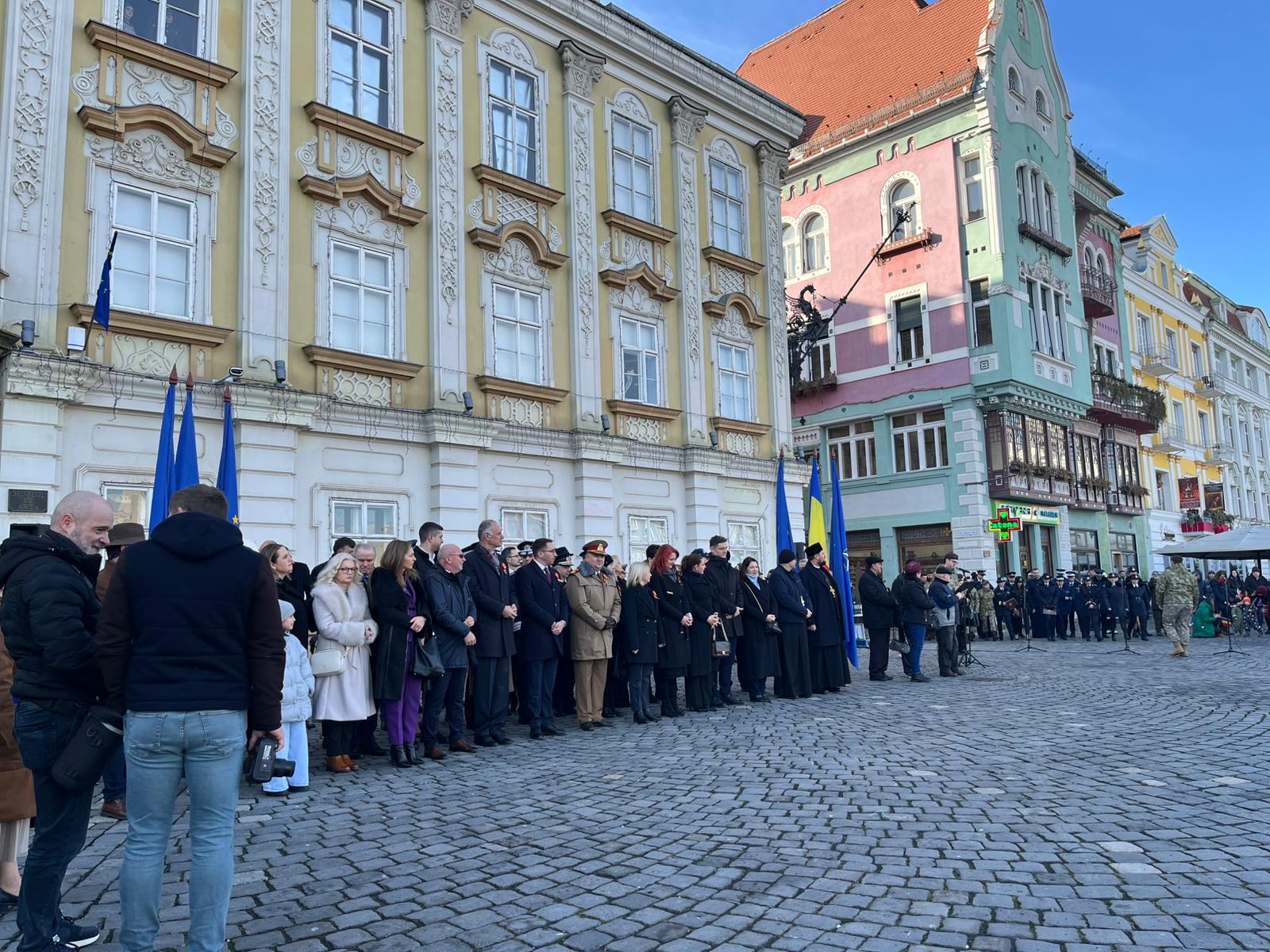 La ceremonia militar religioasă desfășurată în Piața Unirii au fost prezenți și Paula Romocean, viceprimarul Timișoarei, și Alexandru Iovescu, vicepreședintele Consiliului Județean Timiș.