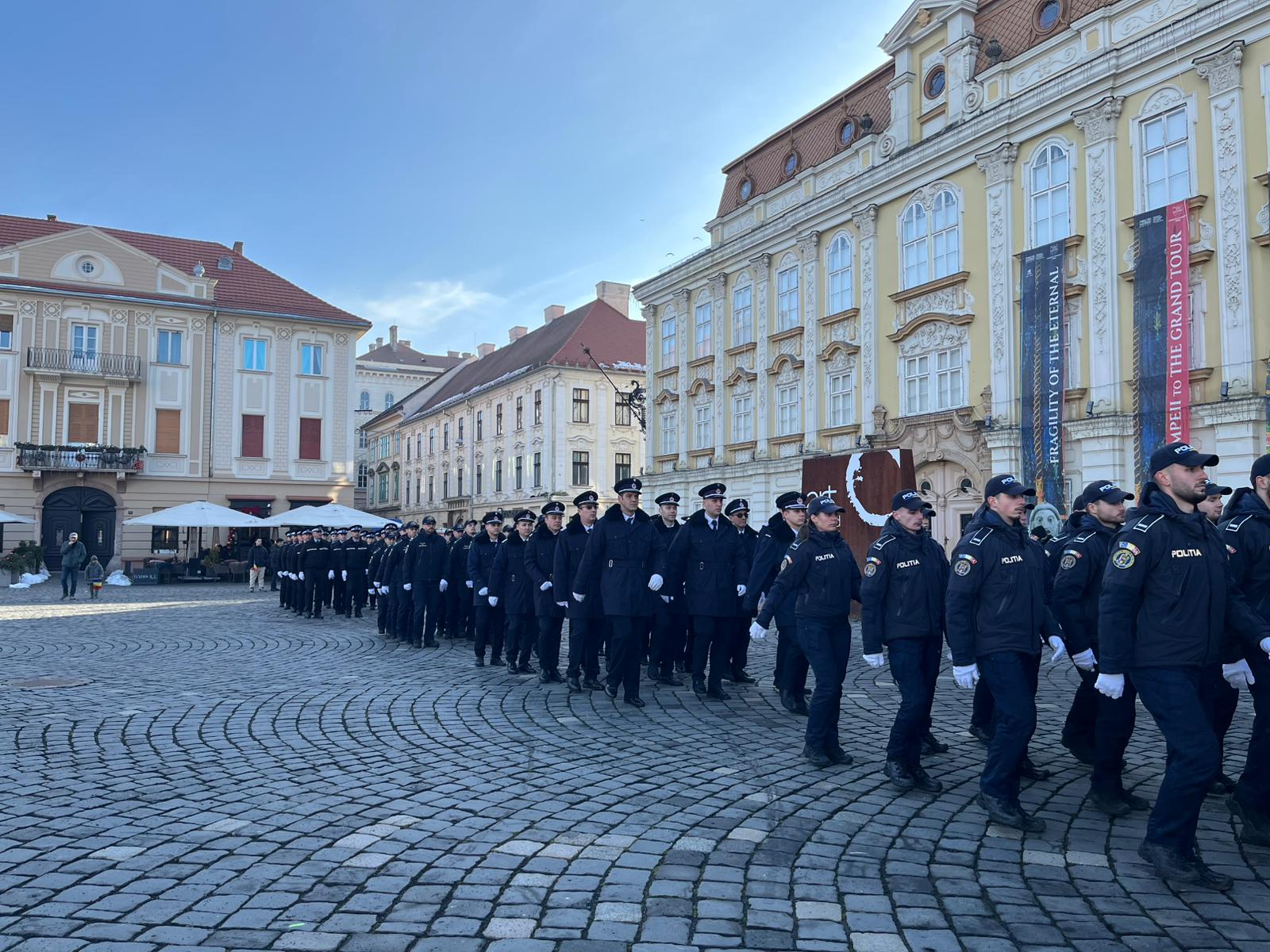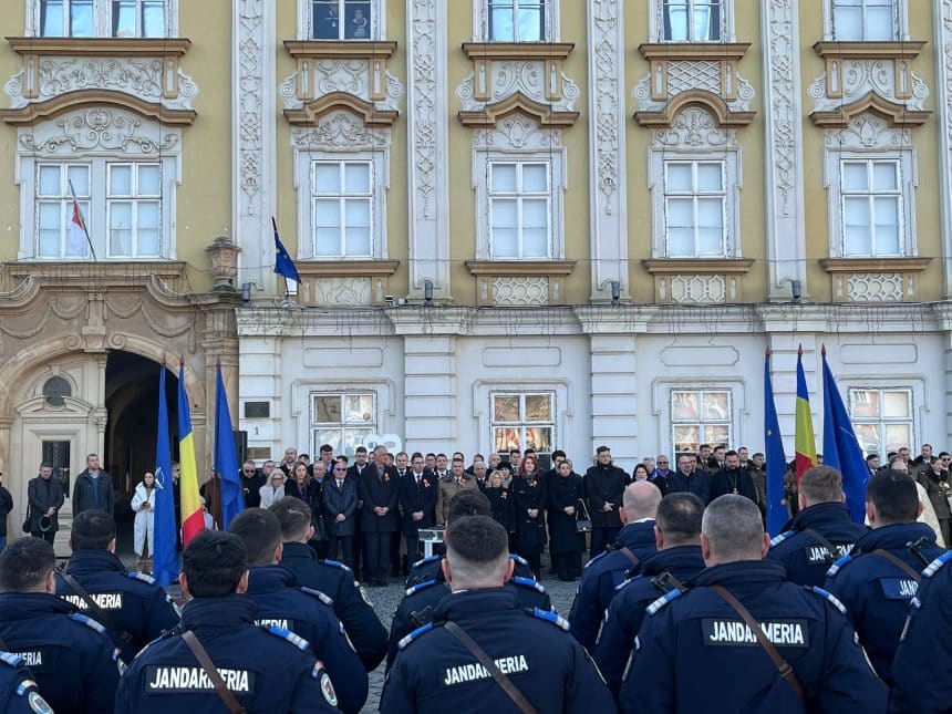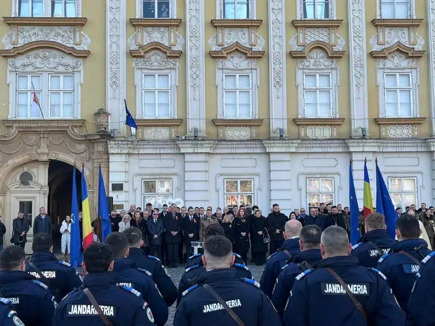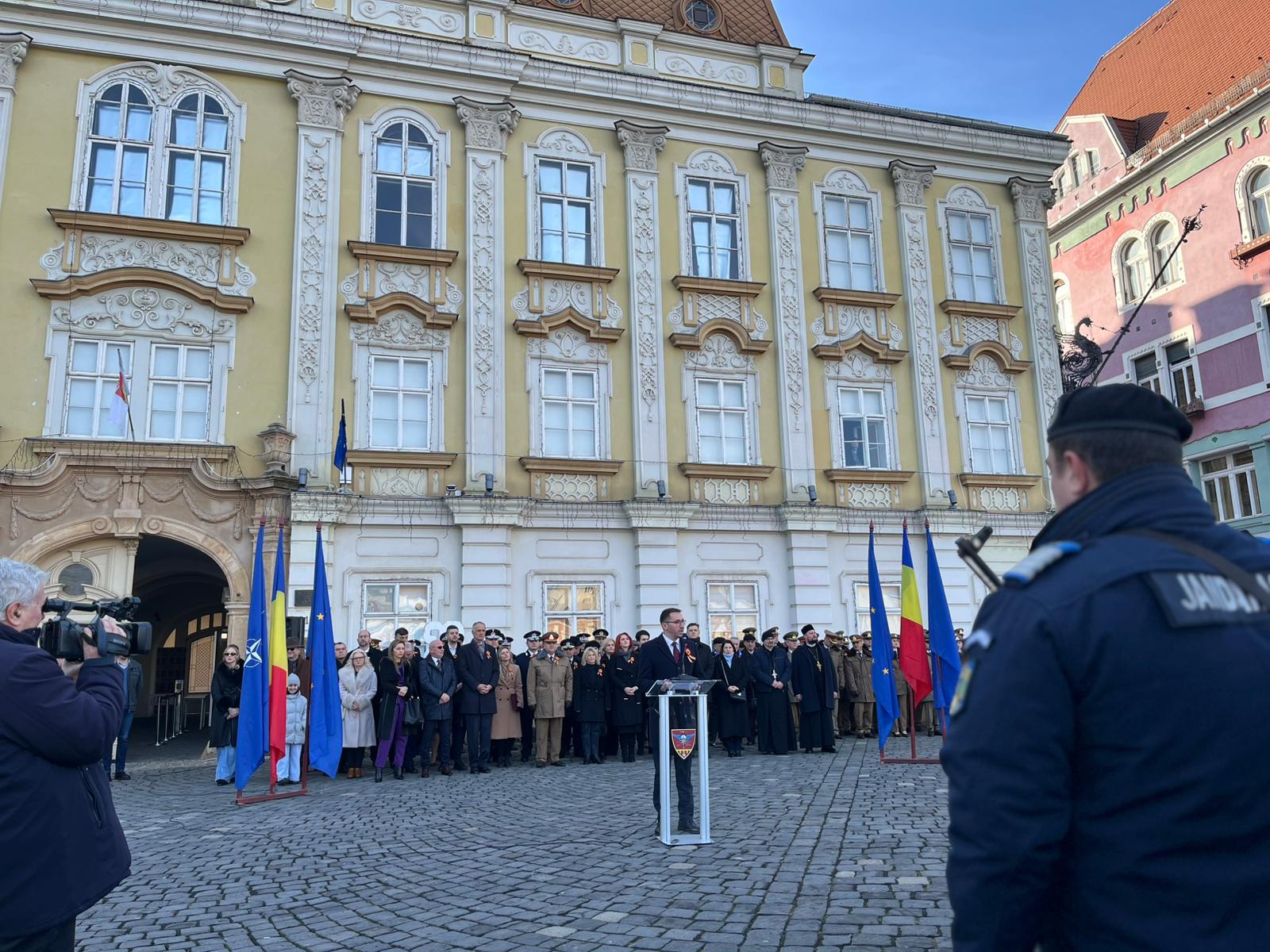 La ceremonia militar religioasă desfășurată în Piața Unirii au fost prezenți și Paula Romocean, viceprimarul Timișoarei, și Alexandru Iovescu, vicepreședintele Consiliului Județean Timiș.