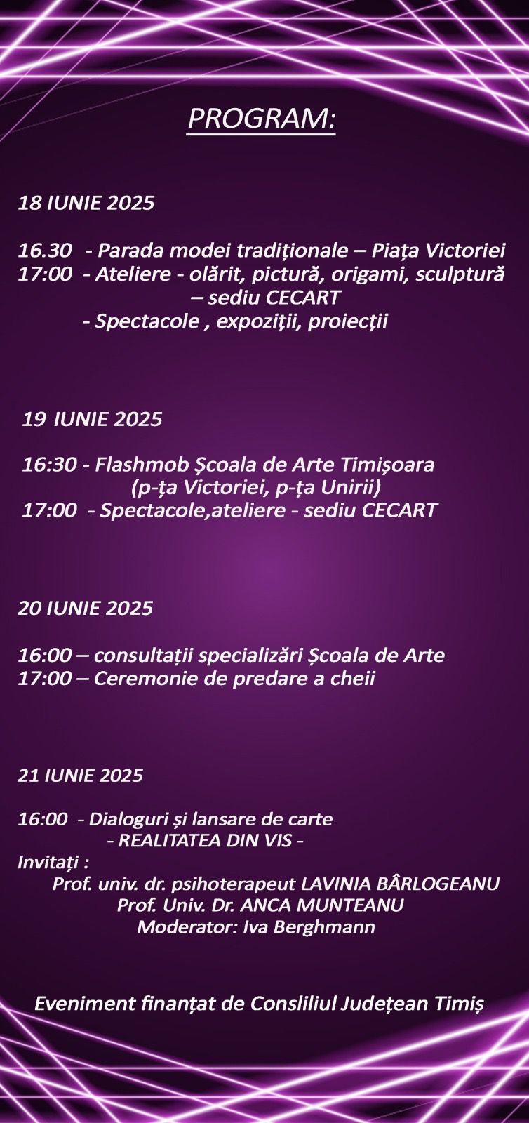 Festivalul debutează miercuri, 18 iunie, la ora 16:30, cu o paradă a modei tradiționale în Piața Victoriei, urmată de deschiderea porților Școlii de Arte Timișoara, pe strada Emanoil Ungureanu nr. 1. Vizitatorii vor fi întâmpinați cu ateliere de olărit, pictură, origami și demonstrații de cioplit în lemn, într-un cadru plin de culoare și creativitate.