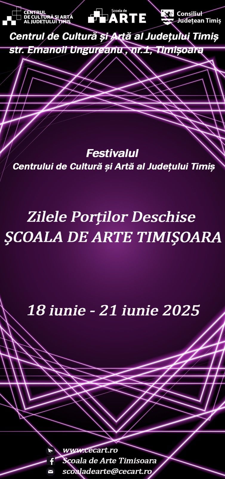 Festivalul Centrului de Cultură și Artă al Județului Timiș are loc la Timișoara între 18 și 21 iunie 2025, sub forma unui eveniment amplu intitulat Zilele Porților Deschise – Școala de Arte Timișoara, organizat cu sprijinul Consiliului Județean Timiș